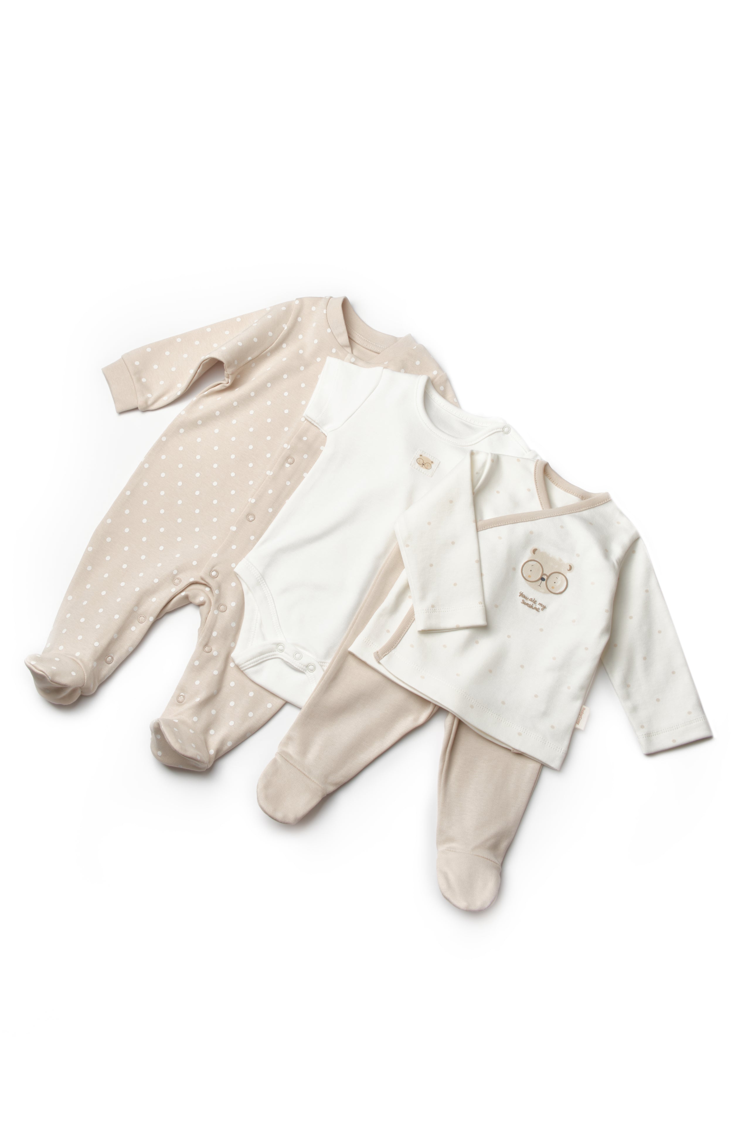 Všetko, čo potrebuje maličké bábätko v prvých týždňoch života, v jednom nádhernom balení. Tento 10-dielny set je stelesnením jemnosti, pohodlia a štýlu – v prírodných tónoch maslovej a béžovej, zdobený roztomilými detailmi ako výšivka medvedíka s okuliarmi či nápis “You are my sunshine”. Vyrobený zo 100 % biobavlny, aby bol šetrný k pokožke bábätka a zároveň dostatočne odolný na každodenné používanie. Set je vhodný pre detičky od 0 do 3 mesiacov.